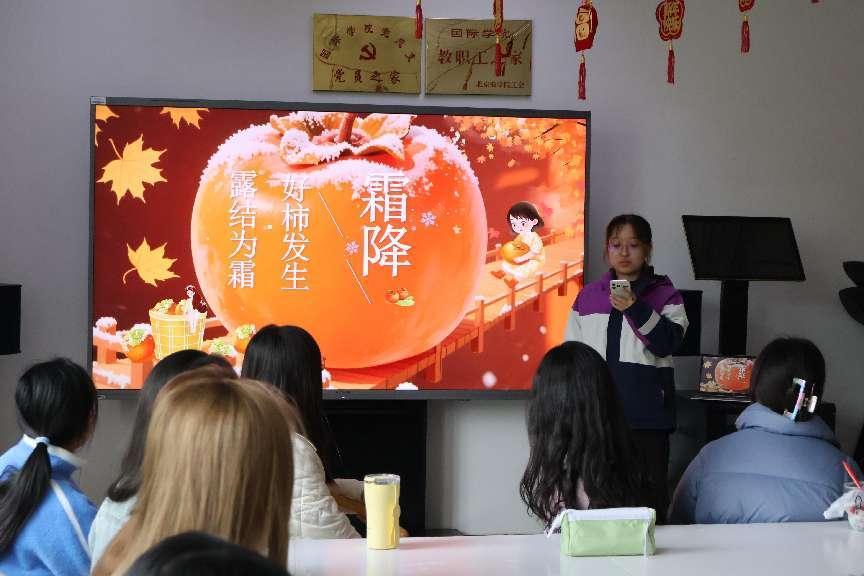 公司员工会主席团成员赵子瑜以“秋日终章,冬日序章”为引,为大家讲解了霜降节气文化内涵。作为二十四节气中秋天的最后一个节气,其“豺乃祭兽、草木黄落、蛰虫咸俯”三候,生动描绘了万物蛰伏的自然节律。饮食上吃柿子寓意“事事如意”,食牛肉萝卜则暗含“补冬”智慧;风俗里登高望远、赏菊祭祖等传统,秋叶因叶绿素降解而呈现的斑斓色彩,共同构成霜降独有的时空美学。