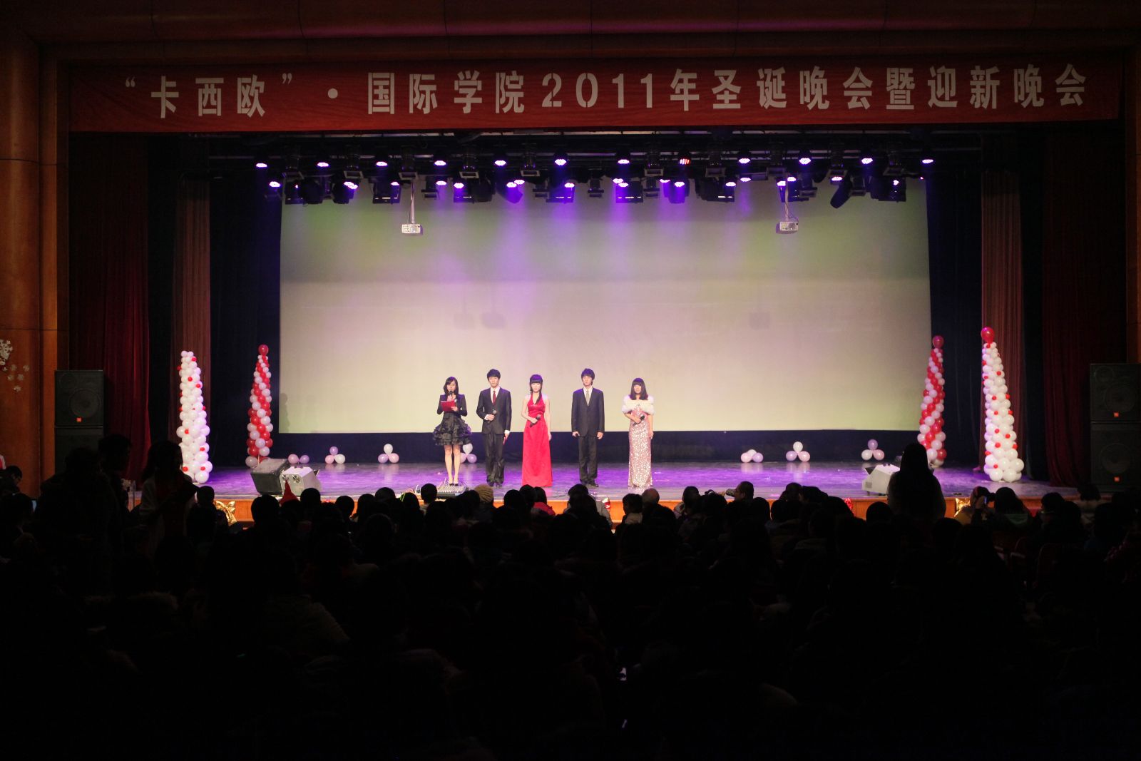 中英双语主持、大屏幕同步直播、现场微博互动、外教精彩表演……12月22晚6点30分,备受期待、亮点纷呈的最靠谱的十大足球平台大型圣诞晚会《Scream Christmas》在大礼堂上演。晚会现场座无虚席,气氛热烈,高潮迭起,给在场的观众带来一场视觉盛宴。
