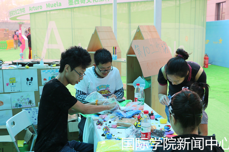 在墨西哥文化工作坊,外国帅哥火虎老师会教你做墨西哥的特色文化—骷髅头。在这里你可以异想天开地在骷髅头上添加细节,展开艺术创想。我们志愿者这几日流利的英文翻译为火虎的教学提供了很大的便利,他对志愿的英文水平给予了很高的评价。