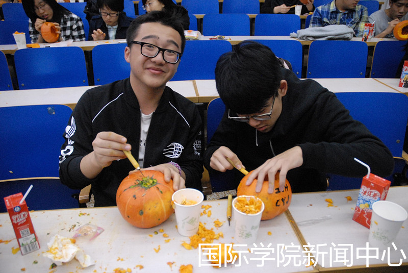 In the “Pumpkin lamp making” program in the lecture theater 1, students learned to make pumpkin lamp by watching a short video. They designed and make a pumpkin lamp bu “Cut the pumpkins’ top”, “Clean the middle of the pumpkin” and “grave”. The smell of pumpkin pervaded in the lecture theater and showed the special atmosphere of Halloween.