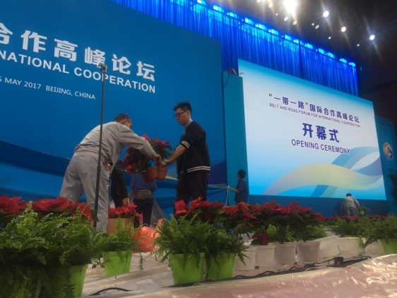 董翔老师借调至“一带一路”国际合作高峰论坛会务组,参与了本次高峰论坛开幕式、高级别全体会议以及平行会议的会务筹备和保障工作。她分属会场布置组,主要负责审核并报批开幕式、全体会议、平行论坛会议场地的布置方案,以及会议期间内部场地布置维护工作。封闭办公后,她每天都要检查33个会场的布置情况,以及全馆10000余株鲜花和941盆绿植的生长情况,做到一早一晚双检查、双汇报。