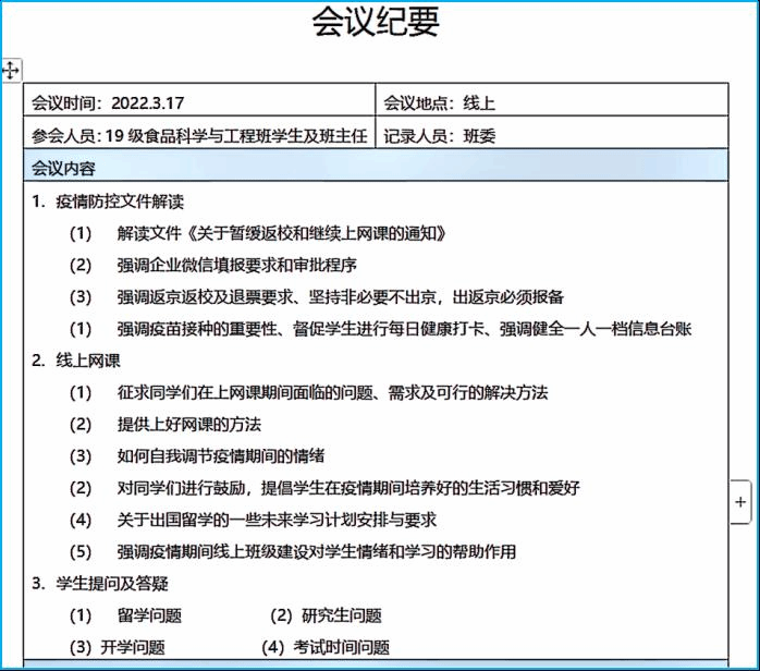 会后,各位班主任结合班级员工实际情况,快速开展线上班会,及时掌握班级员工的状况及诉求,并形成了班会纪要和问卷调查报告,为公司线上工作顺利开展提供了有力的保障。