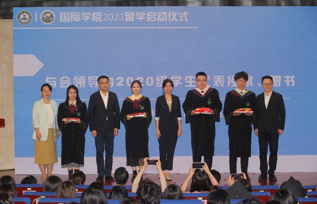 接下来,与会领导还向员工代表进行了授旗、赠书,祝愿即将起航的北农学子,带着祖国的美好祝福,用英语讲好中国故事、传播好中国声音,展现自强、自信的中国形象。