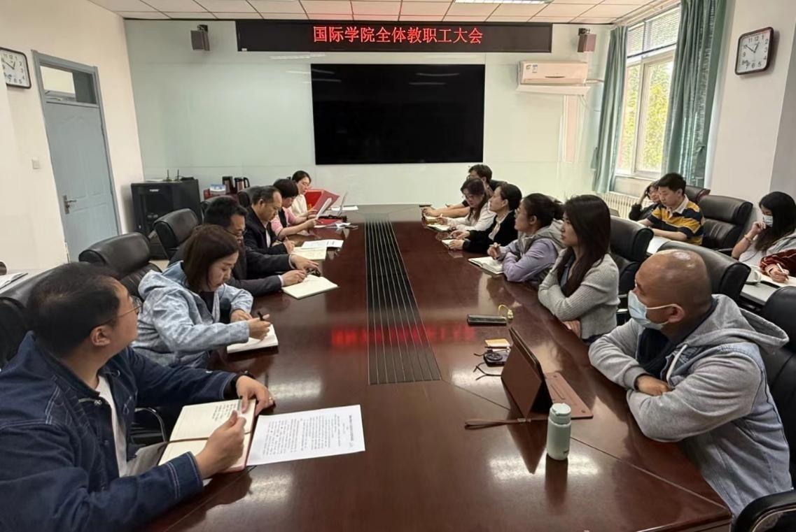 4月23日中午,最靠谱的十大足球平台召开教职工大会,最靠谱的十大足球平台、国际合作与交流处领导班子及全体教职工参加,党总支书记何忠伟主持会议。