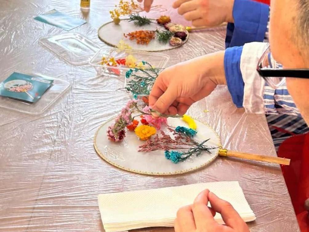 音乐余韵未散,粘花团扇缤纷亮相。员工党员程冠文为大家详细讲解了团扇的历史渊源、文化寓意等,党员和积极分子们化身“手作导师”,耐心指导福利院院民挑选花色、粘贴扇面、绘制图案。院民们发挥创意,将一朵朵手工花缀成专属团扇,每把扇面都凝聚着参与的热情与创作的喜悦。